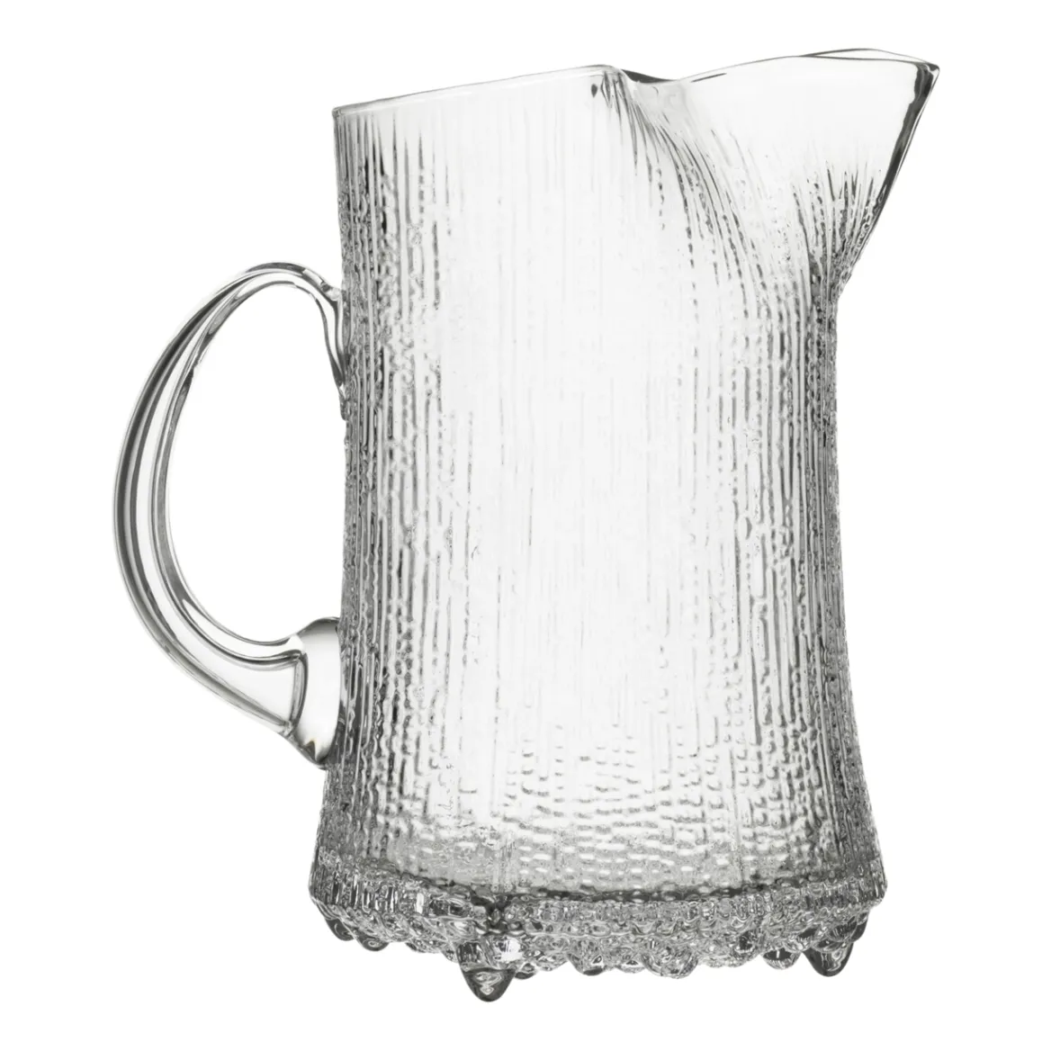 Suomen luonto oli Tapio Wirkkalalle suurin inspiraation lähde. Wirkkala uudisti lasinpuhalluksen perinnettä klassisella Ultima Thule -sarjallaan. Wirkkala käytti Iittalan lasitehtaan lasinpuhaltajien kanssa lähes tuhat työtuntia kehittäessään uutta lasinvalmistustekniikkaa. Näin saatiin aikaan lasia, jonka pintarakenne jäljittelee muotoilijaa inspiroinutta sulavan jään ja lumen pintaa. Ultima Thule -lasistolle luonteenomaista on pyöristetty pohja, jota kannattelee kolme sulavilta jääpuikoilta näyttävää jalkaa. Ultima Thule -sarja tuo sisustukseen sävyjä arktisesta luonnosta. Ultima Thule -kaadin on kaunis arki- ja juhlakattauksissa. Kaunis lasikannu sopii kylmien juomien tarjoiluun. Hieno lahja.