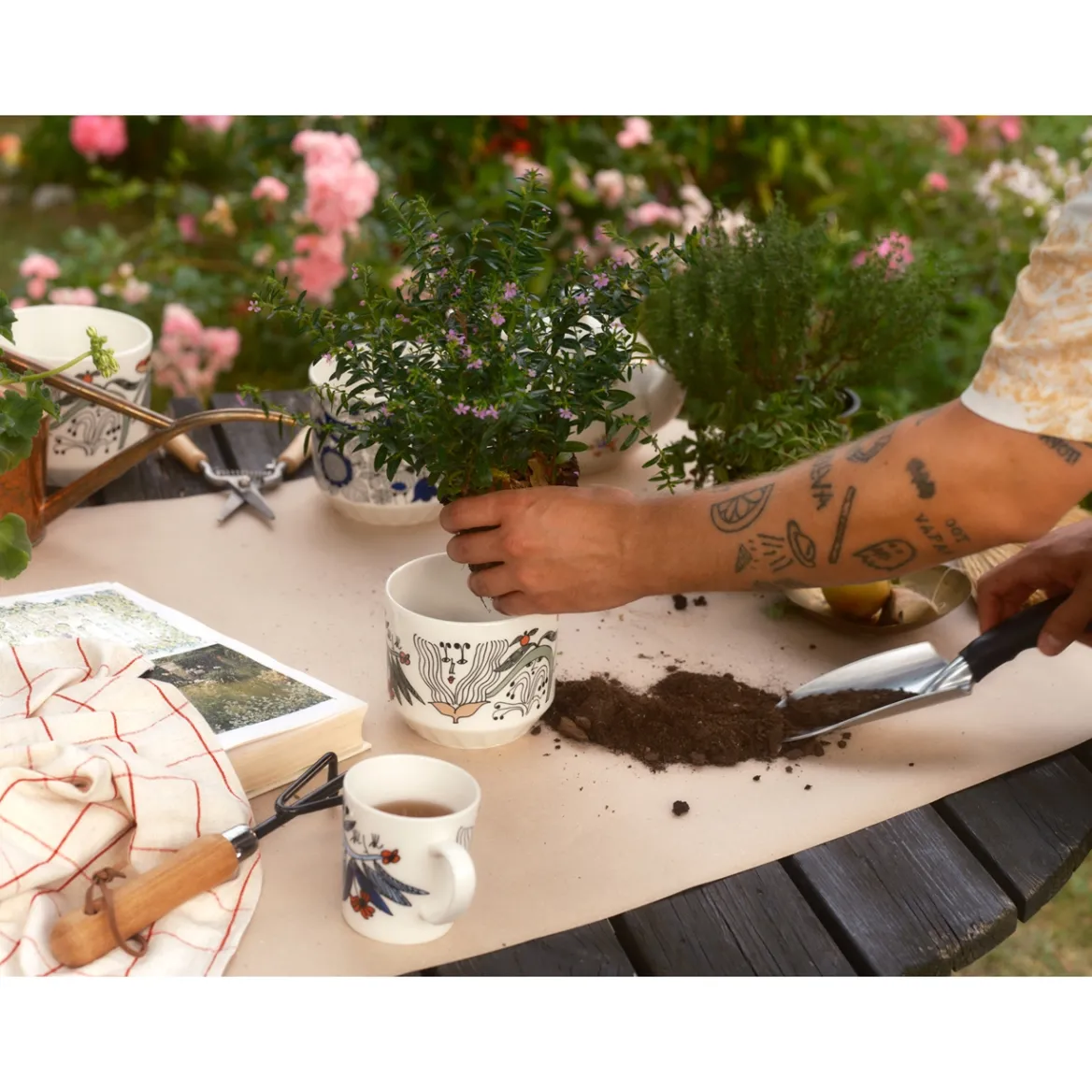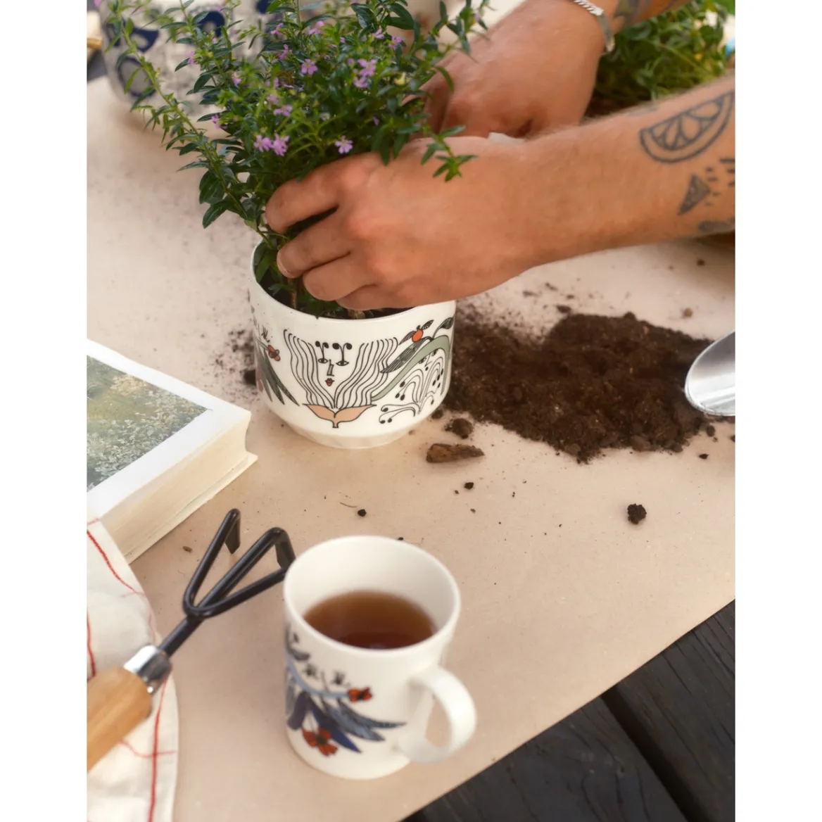 Taiteilja Armi Tevan luoma Puutarhurit-kuvio koristaa Arabian rakastetut kuviot -sarjan uutta kukkaruukkua. Armi Tevan kiehtovat hauskat hahmot ja ruukun kiinnostava design sopivat viherkasveille ja sisäkukille loistavasti. Puutarhurit-kuvion värimaailma sointuu kauniisti yhteen muiden Arabian rakastetut kuviot -sarjan koristeiden kanssa.