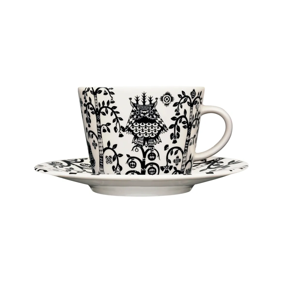 Taika-sarjassa Klaus Haapaniemen fantasiataide ja Heikki Orvolan selkeä muotoilu yhdistyvät ilomieliseksi kokonaisuudeksi. Lumoavan sarjan kuvioinnissa on viitteitä satujen ja tarinoiden rikkaaseen kuvastoon, joka nousee kauniisti esiin pelkistetyssä ja selkeässä muotoilussa. Monikäyttöisten ja kestävien posliiniastioiden värikkäät hahmot luovat arjen kattauksiin kansanperinteen ja satumaailman lumoa. Taika-kahvi- ja cappucinokuppien kaunis kuviointi tuo iloa arjen kahvihetkeen. Mustavalkoisen kuvioinnin rikkaat yksityiskohdat korostavat kupin selkeää muotoa. Kaunis kokonaisuus yhteensopivan lautasen kanssa (halkaisija 15 cm).