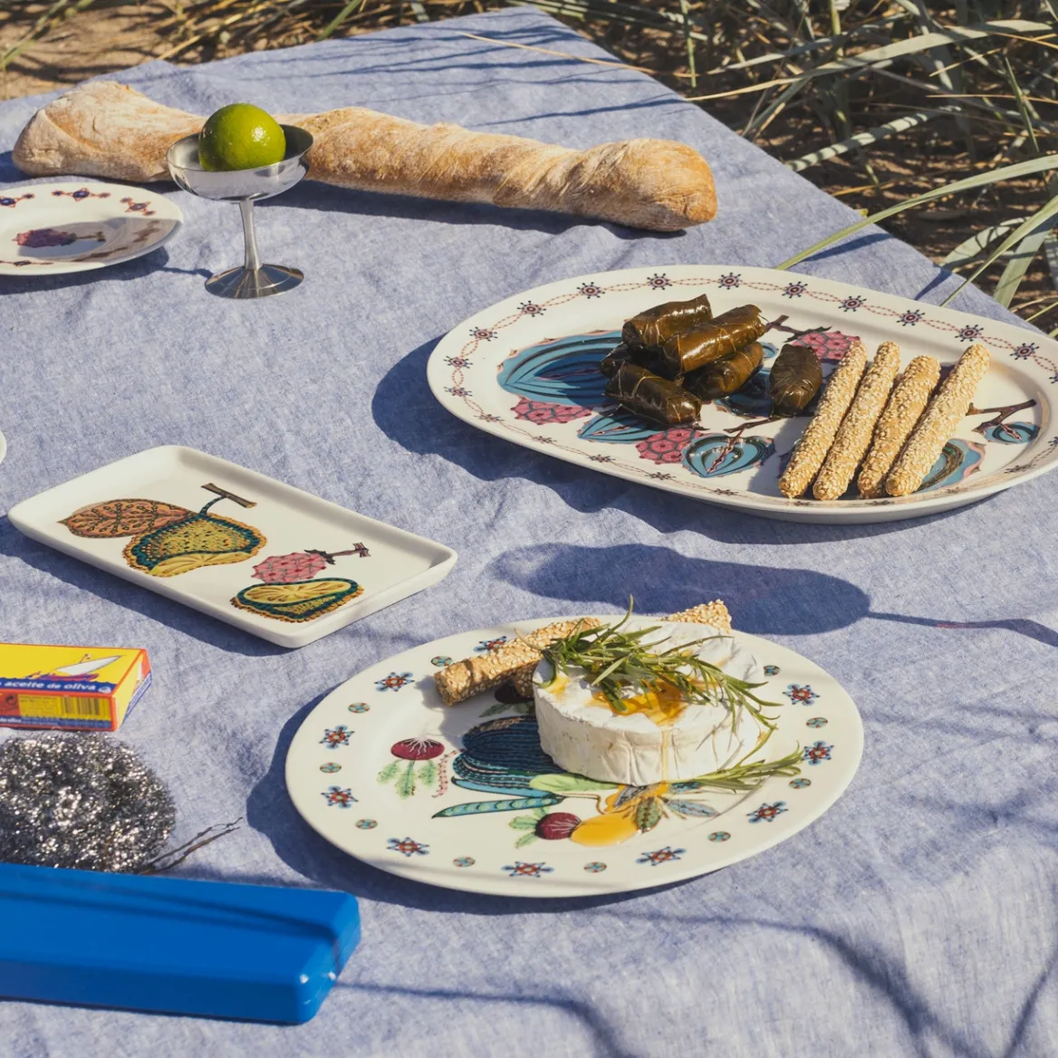 Taika Sato suorakaiteen muotoinen lautanen sopii tarjoiluun ja on kaunis sisustusesine sellaisenaan. Klaus Haapaniemen kiehtovat kuvitukset yhdistyvät Heikki Orvolan pelkistettyihin muotoihin, luoden oman universuminsa. Yhdistä lautanen sarjan muihin osiin ja loihdi esiin runsas sadonkorjuu kattaus tai piristä hillitympää kattausta tarkoin harkitulla yksityiskohdalla. Tässä sarjassa lautanen ei ole vain lautanen vaan mahdollisuuksia on loputtomasti. Kerää yöpöydällä pyörivät korut kauniiksi asetelmaksi, järjestä eteisessä pyörivät avaimet ja pikkutavarat selkeään paikkaan tai loihdi kylpyhuoneeseen kaunis asetelma.