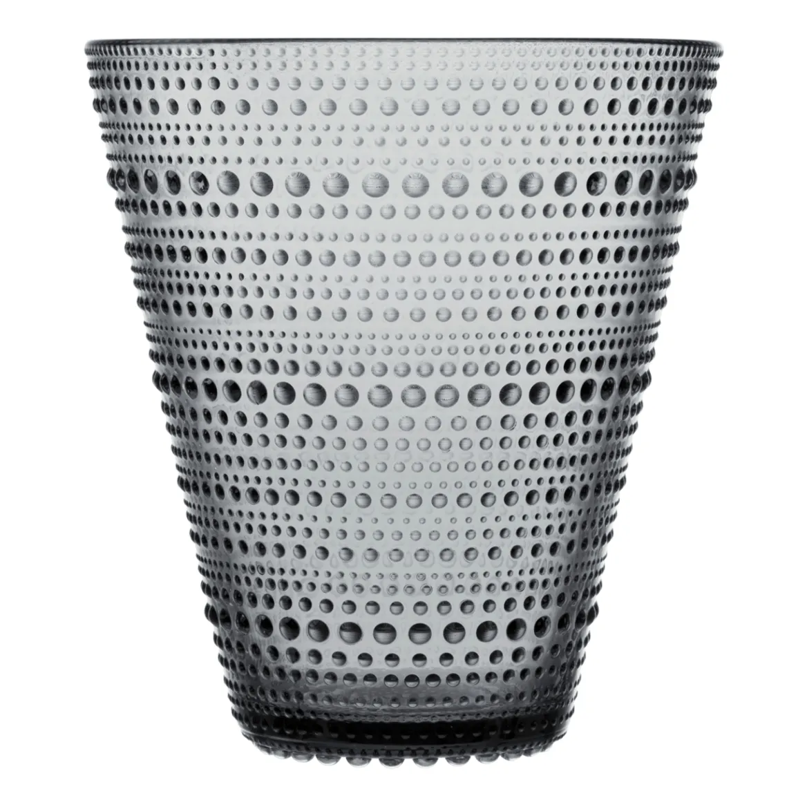 Kastehelmi-sarjan ainutlaatuinen pisaramainen pintarakenne syntyi muotoilija Oiva Toikan halusta peittää puristelasiin jäävät saumakohdat. Kastehelmi-sarjan pintastruktuurin sädehtivät lasihelmirivit muistuttavat aamuauringossa kimaltavaa kastetta. Rakastettuun Kastehelmi-sarjaan kuuluu erikokoisia käytännöllisiä ja koristeellisia lasiastioita. Yksilöllisten ja monikäyttöisten lasiastioiden pintarakenteen lasipisarat heijastavat kauniisti valoa. Herkän kauniin ja kestävän Kastehelmi-maljakon pelkistetty muoto sopii tyylikkäästi kaikkiin sisustuksiin. Harmaa sävy tuo kukka-asetelman kauniisti esiin. Näyttävä pöytäkoriste. Upea syntymäpäivälahja, häälahja tai tuparilahjaidea.