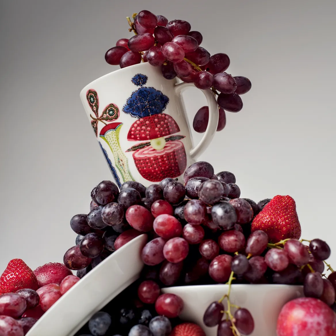 Taika Sato yhdistää Klaus Haapaniemen kiehtovan kuvituksen Heikki Orvolan ajattomaan ja pelkistettyyn muotoiluun. Maalaustaiteen inspiroimassa kuviossa on kiinnostava asetelma hedelmiä ja vihanneksia. Tämä runsas kuvitus inspiroi luomaan omia arjen tarinoita kattauksessa ja sisustuksessa. Reilun kokonsa ansiosta 0,4L muki sopii kaikille kuumille juomille. Osuva lahjaidea kahvin tai teen ystävälle, joka ei halua heti täyttää kuppiaan uudelleen. Muki on mikrouunin ja konepesun kestävä.