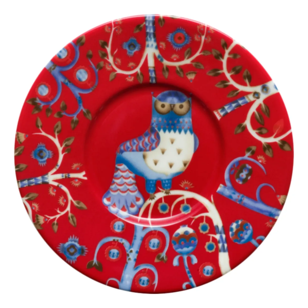 Taika-sarjassa Klaus Haapaniemen fantasiataide yhdistyy Heikki Orvolan funktionaaliseen muotoiluun. Lumoavan sarjan kuviointi on saanut inspiraationsa kansanperinteen ja satujen kuvamaailmasta, joka nousee kauniisti esiin pelkistetyssä ja selkeässä muotoilussa. Monikäyttöiset ja kestävät astiat luovat kaikkiin kattauksiin taianomaista tunnelmaa ja mielikuvituksellisuutta. Taika-lautanen sopii pyöristettyjen reunojen ansiosta täydellisesti kahvi- ja cappucinokupin aluslautaseksi. . Punainen taustaväri korostaa värikkään pöllöaiheisen kuvioinnin runsaita yksityiskohtia. Yhdistele erivärisiä astioita hauskaksi kokonaisuudeksi. Kerää yksittäisistä osista kokonainen sarja. Hieno häälahja- tai tuparilahjaidea. Mikrouunin ja konepesun kestävä.